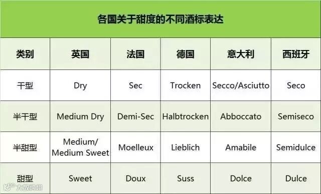 既然有的干型葡萄酒尝起来有点甜,甜型葡萄酒也不一定见得有多甜,那怎么才能知道一款葡萄酒是干型还是甜型呢?其实,有些国家(特别是德国)的葡萄酒酒标上会给出一些词语来表示含糖量。以下是不同国家关于甜度的不同酒标表达,如图: