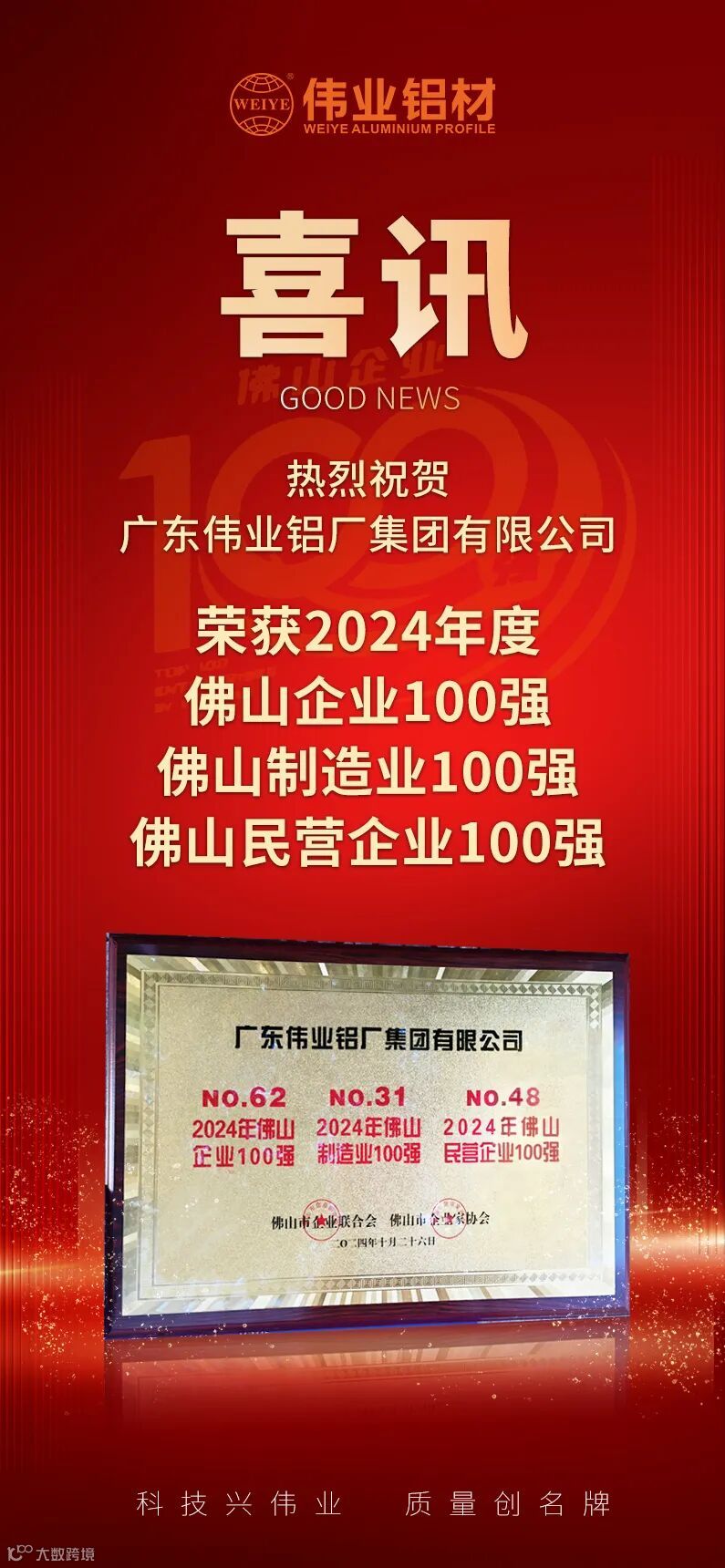 10月26日,佛山市企业联合会、佛山市企业家协会成立40周年庆典暨年度佛山企业家活动日隆重举行。现场发布了2024年佛山企业100强、制造业100强、民营企业100强等重磅榜单。伟业凭借强大的综合实力和代表性新质生产力,荣登“2024年佛山企业100强第62位”、“佛山制造业100强第31位”、“佛山民营企业100强第48位”,相较2023年均实现了排名的攀升!