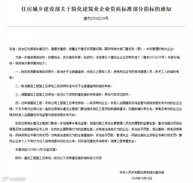 三、调整建筑工程施工总承包一级及以下资质的建筑面积考核指标,具体内容详见附件。
