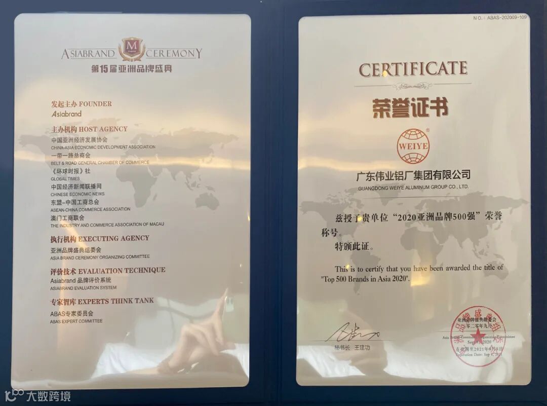 广东伟业铝厂集团有限公司凭借其优良的产品品质、深厚的品牌积淀,取得了铝型材行业的领导地位,六次蝉联“亚洲品牌500强”,