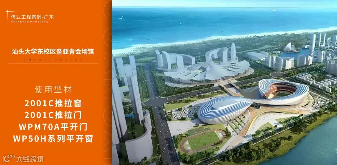 汕头大学东校区暨亚青会场馆作为主场馆,是汕头新文体地标,采用伟业WP50H系列平开窗,2001C推拉窗、2001C推拉门,WPM70A平开门,建筑造型“飞舞的浪花”展现汕头人“勇立潮头,大浪淘沙”文化特色。