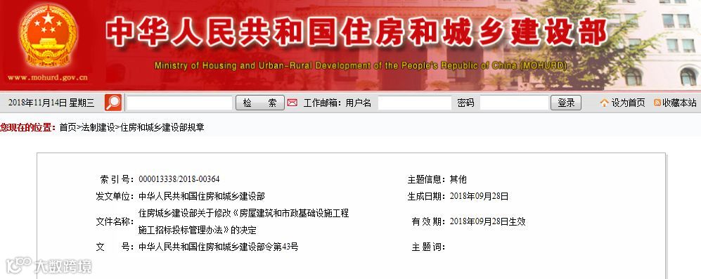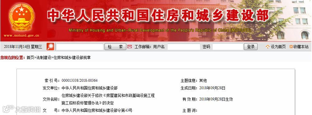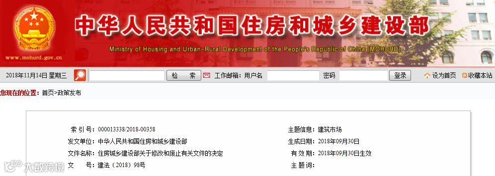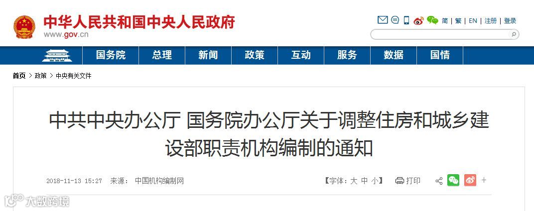 2018年11月13日,中央人民政府官网正式刊登发布了《中共中央办公厅 国务院办公厅关于调整住房和城乡建设部职责机构编制的通知》。