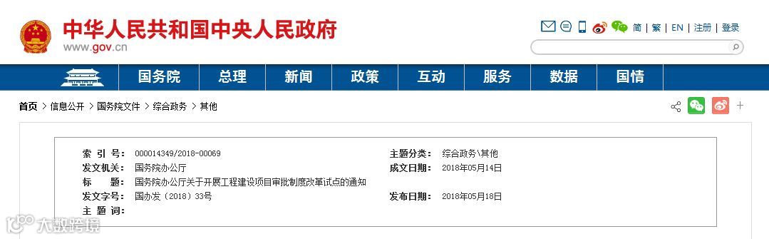 2018年5月14日,国务院办公厅正式颁布《国务院办公厅关于开展工程建设项目审批制度改革试点的通知》(国办发〔2018〕33号),《通知》提出2018年试点地区建成工程建设项目审批制度框架和管理系统,按照规定的流程,审批时间压减一半以上,由目前平均200多个工作日压减至120个工作日。将大大精简审批环节,主要包括: