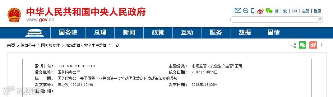 2018年11月08日国务院办公厅下发《国务院办公厅关于聚焦企业关切进一步推动优化营商环境政策落实的通知》(国办发(2018)104号),通知明确提出:进一步简化企业投资审批。