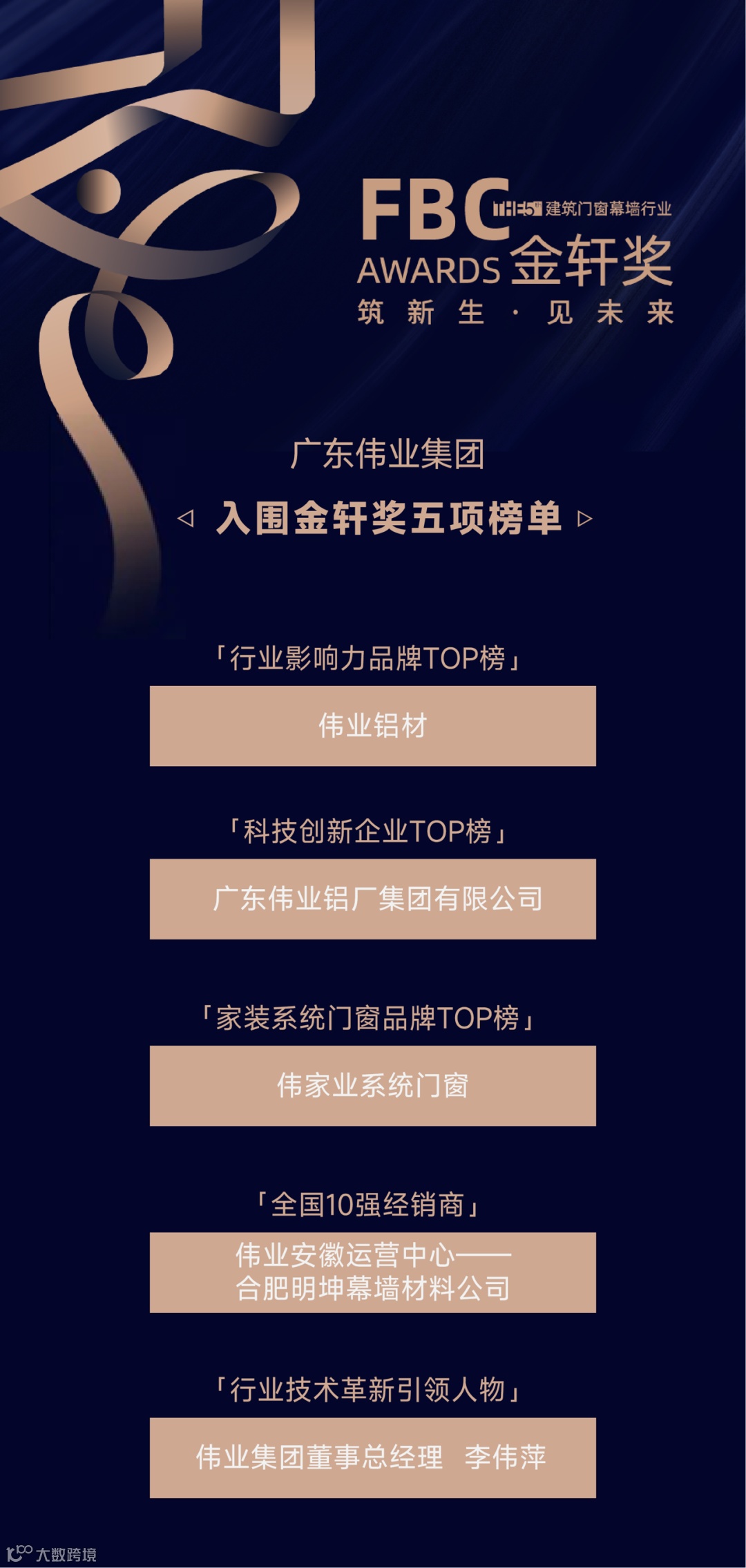 广东伟业集团入围金轩奖当中五项榜单,其中“行业影响力品牌TOP榜”、“科技创新企业TOP榜”、“行业技术革新引领人物”为100%评委会投票。