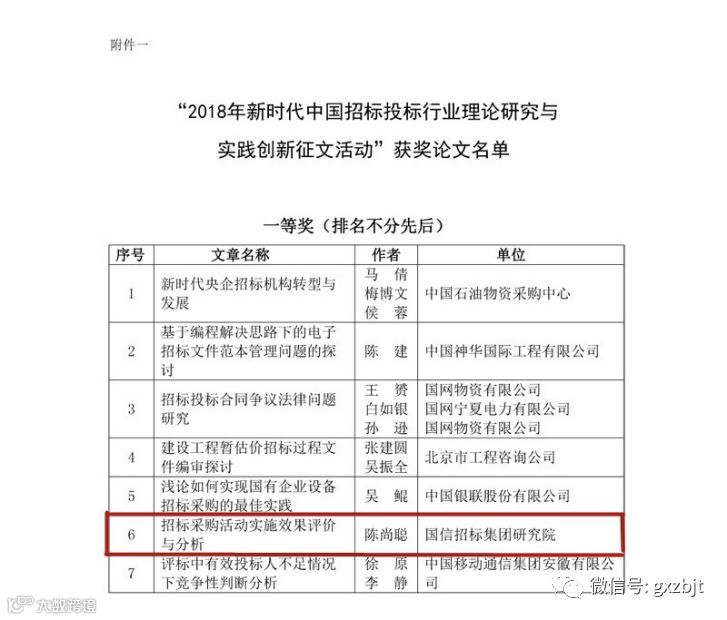 集团荣获“2018年新时代中国招标投标行业理论研究与实践创新征文活动”优秀组织单位,国信招标集团研究院陈尚聪论文获一等奖,另有两人获二等奖。