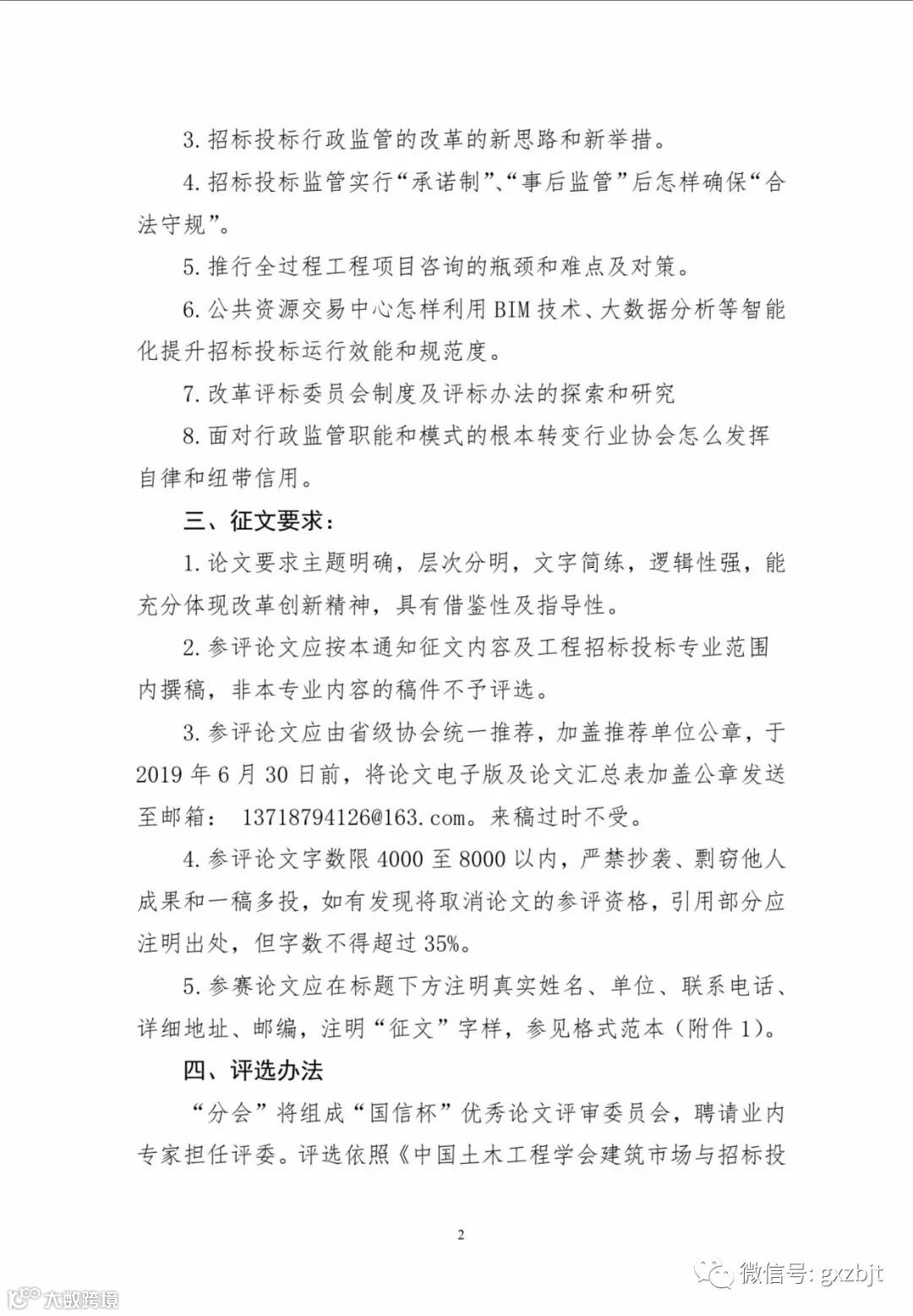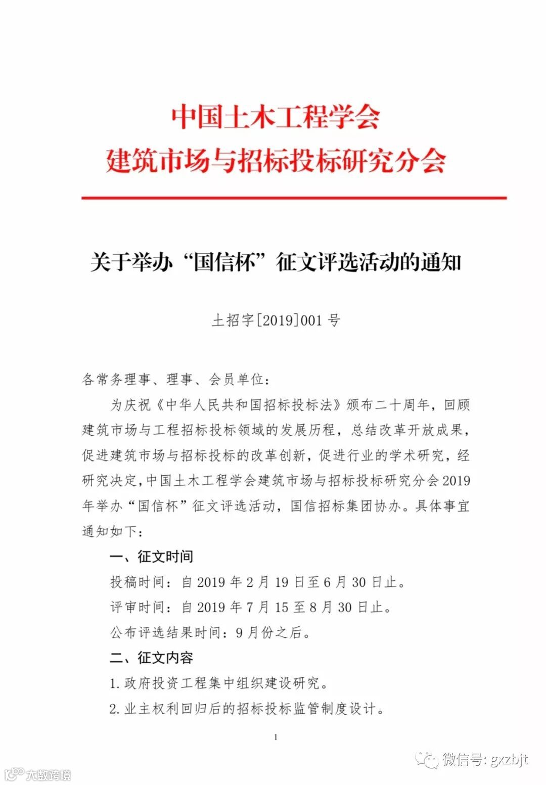 为庆祝《中华人民共和国招标投标法》颁布二十周年,回顾建筑市场与工程招标投标领域的发展历程,总结改革开放成果,促进建筑市场与招标投标的改革创新,促进行业的学术研究,经研究决定,中国土木工程学会建筑市场与招标投标研究分会2019年举办“国信杯”征文评选活动,国信招标集团协办。具体事宜通知如下,欢迎大家积极投稿!