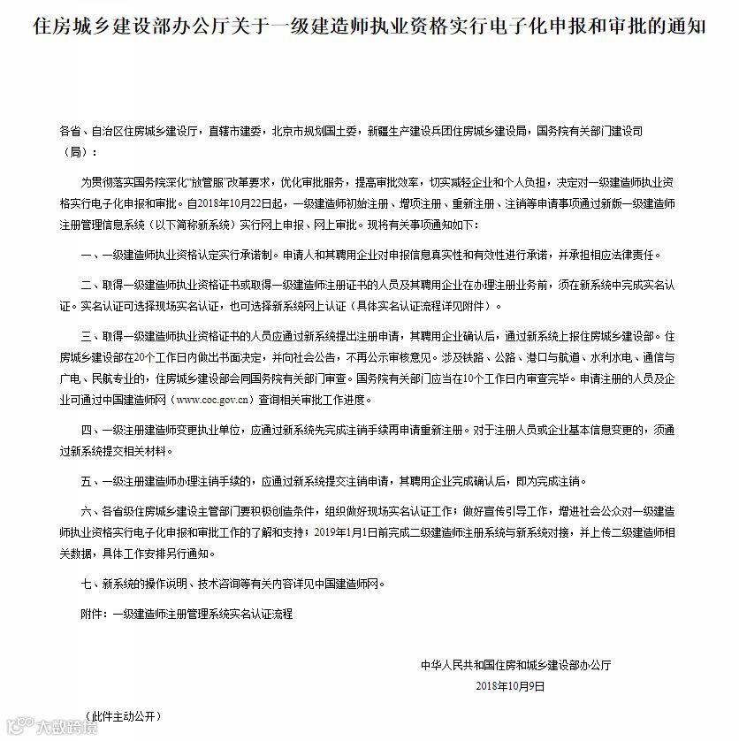 为贯彻落实国务院深化“放管服”改革要求,优化审批服务,提高审批效率,切实减轻企业和个人负担,决定对一级建造师执业资格实行电子化申报和审批。自2018年10月22日起,一级建造师初始注册、增项注册、重新注册、注销等申请事项通过新版一级建造师注册管理信息系统(以下简称新系统)实行网上申报、网上审批。现将有关事项通知如下: