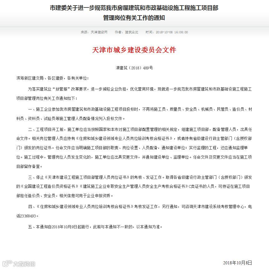 10月8日,天津住建委下发文件,对工程施工项目部人员管理提出新要求。具体如下: