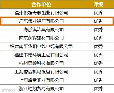 2020年5月9日,融信集团发布2018-2019年度优秀供应商名录,广东伟业铝厂光荣上榜,荣获融创中国2019年材料设备类优秀供应商。