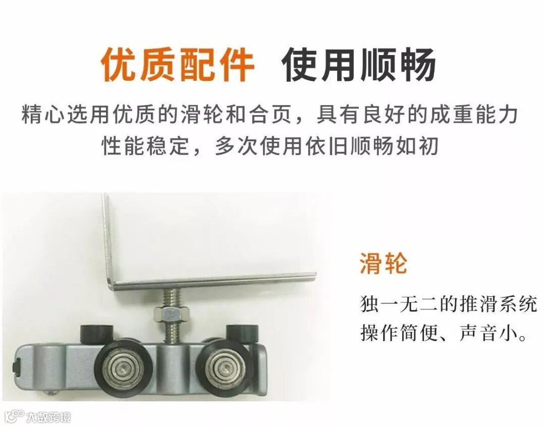 推拉扇上横料的两边装有两组滑轮,滑轮与吊轨配合,让推拉扇滑动。