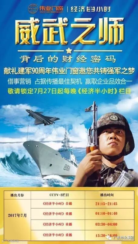 中国人民解放军已经建设成一支现代化、信息化的部队,从硬实力方面来看,我们的武器装备实力位列全球“第一梯队”!为了展现强大国防背后的财经力量,为建军90周年隆重献礼,伟业门窗携手财经频道播报大型纪录片《威武之师背后的财经密码》,7月27日起每晚21:15-22:00重磅揭秘!
