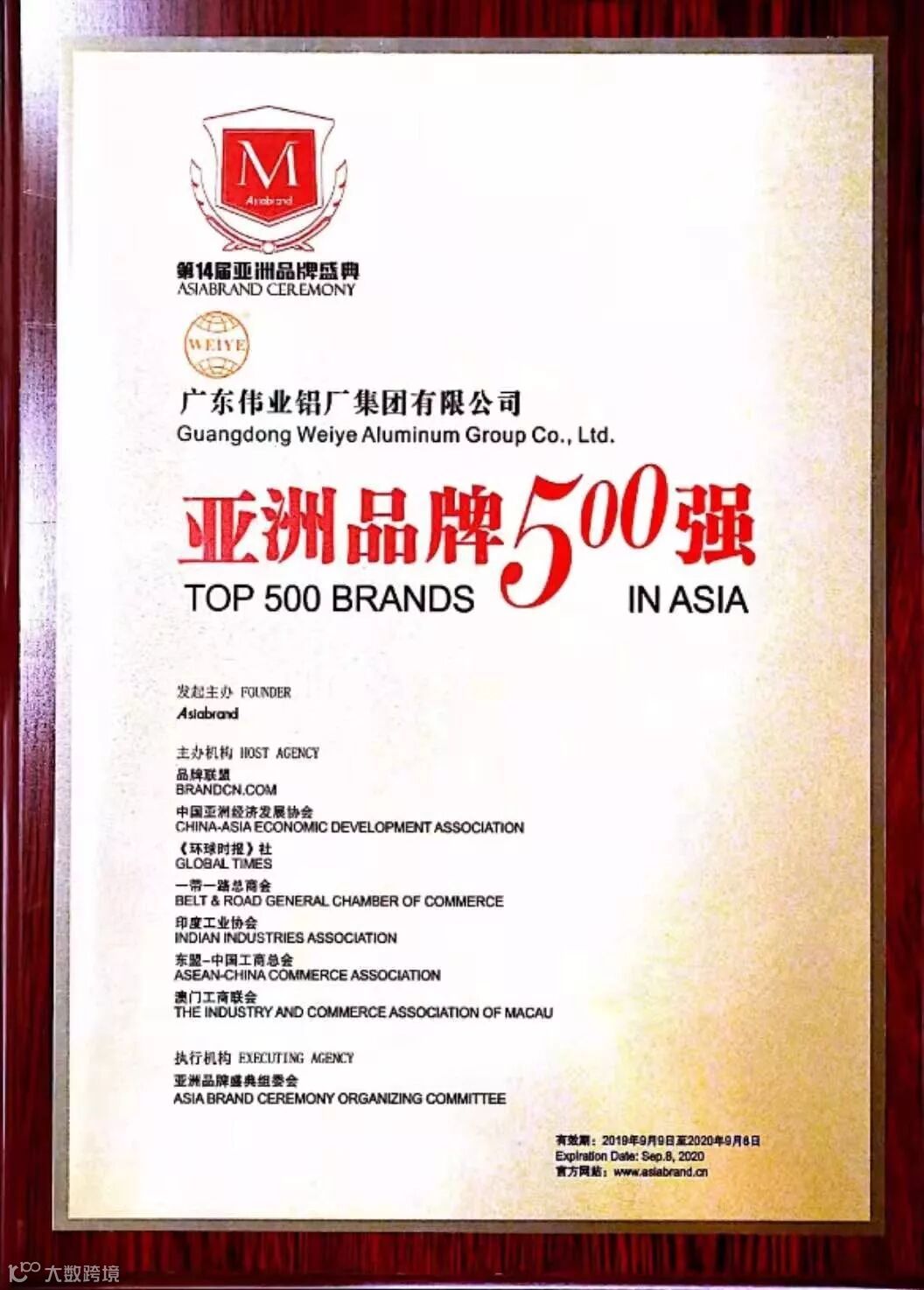 产品品质优良、品牌积淀深厚以及在铝型材行业的领导地位,是广东伟业集团此次入选“亚洲品牌500强”的重要原因。近年来,伟业积极推进品牌建设,此前已数次入选“中国最具价值品牌”排行榜,本次由亚洲品牌测评体系评估,所属亚洲品牌500强第300名。