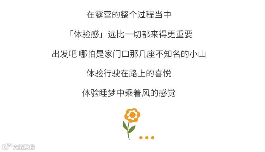 导读:在露营的整个过程当中 「体验感」远比一切都来得更重要 出发吧 哪怕是家门口那几座不知名的小山 体验行驶在路上的喜悦 体验睡梦中乘着风的感觉