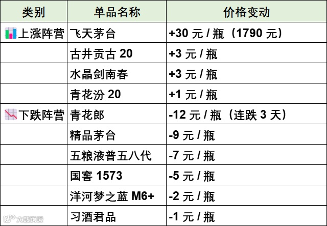 白酒十大单品价格变动一览