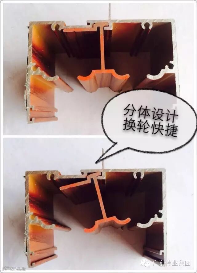 2、吊上滑分体设计,更换吊轮简单快捷。为了减轻库存和资金压力,内扇料特殊设计,一模两用,只需一把铁钳就可轻松地由8厘变为18厘玻璃槽;