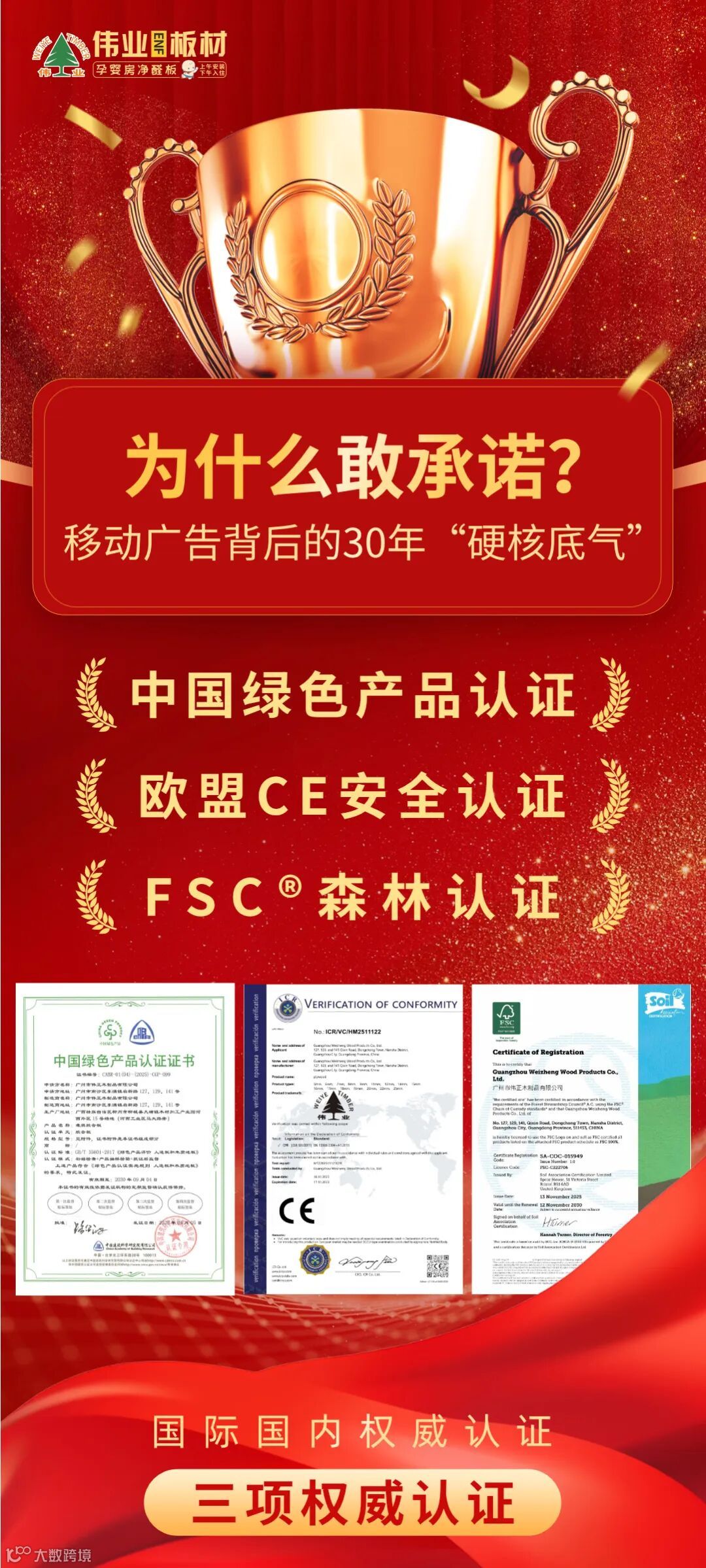 三项权威认证,三位一体,构成了伟业板材完整、透明、可溯源的环保信任链。30如一日对品质的专注与死磕,让我们有底气将承诺写在车身,更期待写进千家万户历久弥新的居住体验里。