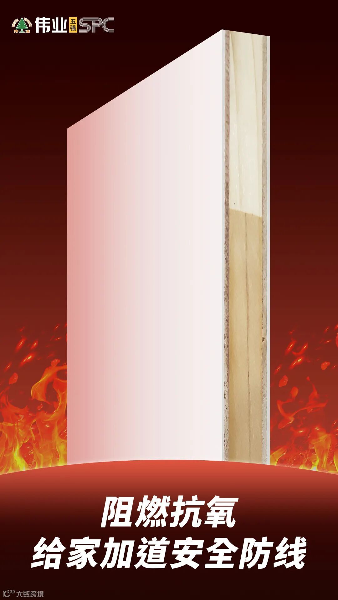 如果说SPC材质是“基础防护”,那叠加伟业五强板的核心性能,就是开启“全屏守护”模式。要知道,五强板本身就有净醛、防虫、阻燃、耐水、定型五大能力,再加上SPC层的加持,六大核心性能直接拉满: