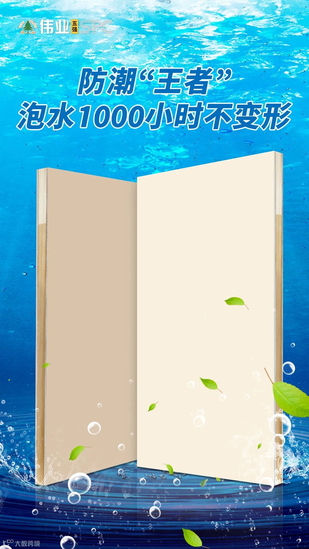 南方梅雨季,厨卫区域是传统板材的“死亡区”,对伟业五强SPC板来说就是“常规操作”。SPC层的防水性+五强板的二类防水标准,让板材在水里泡1000小时,不开胶、不膨胀,全屋定制不再“挑空间”。
