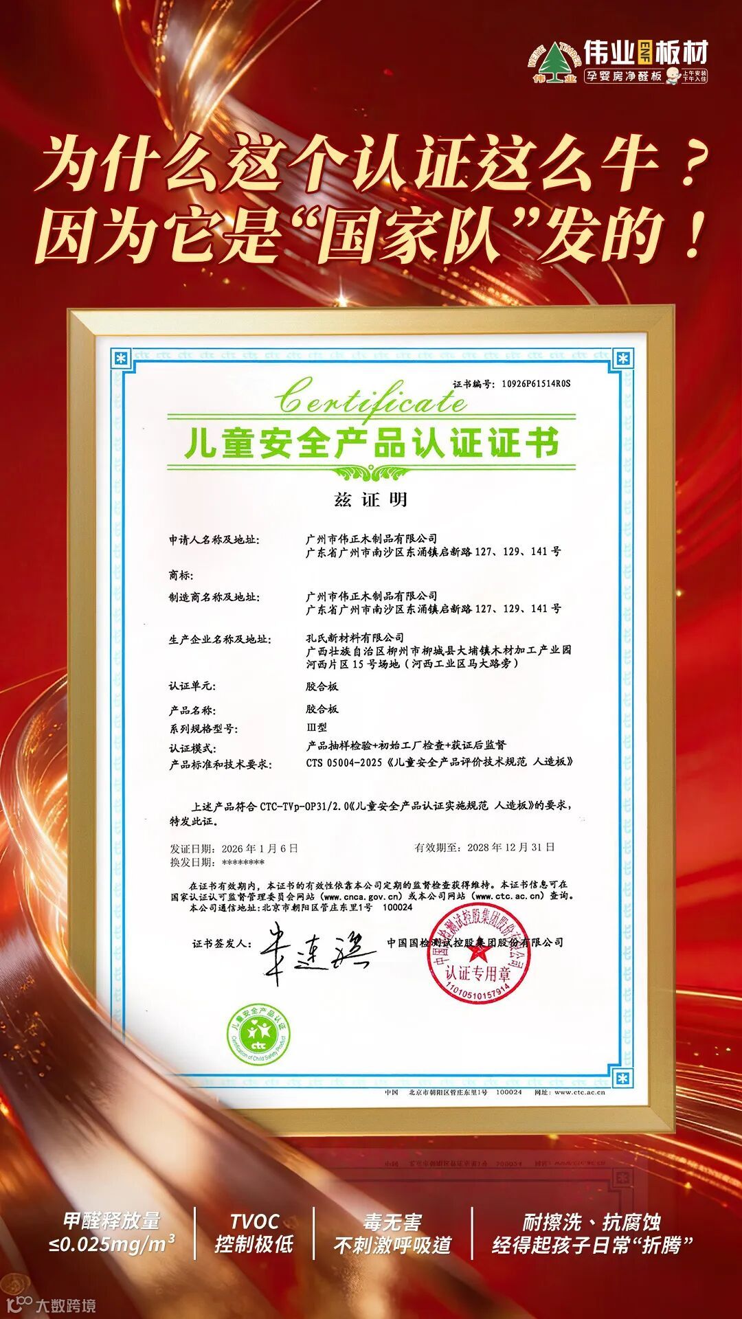 今天,重磅消息来了——伟业胶合板正式获得国家权威认证:《儿童安全产品认证证书》!这是对环保性能的最高级别认可,也是对家庭健康的硬核承诺。