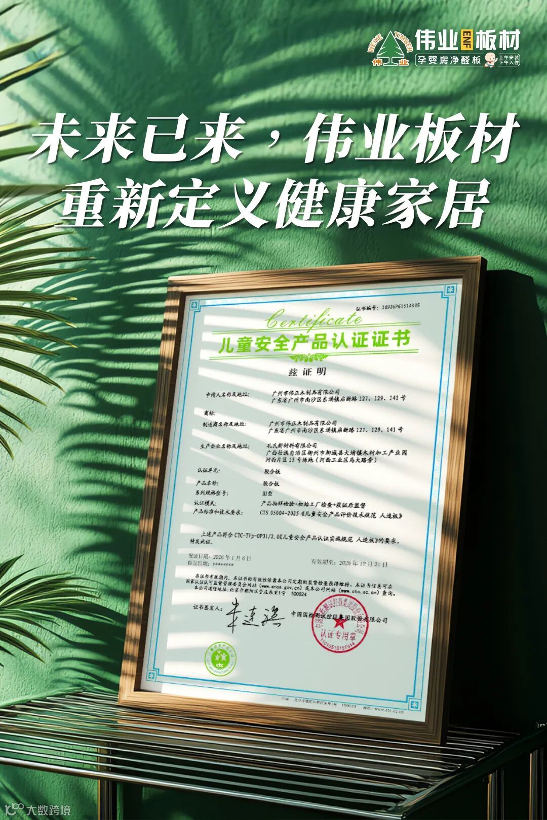 这张证书,是通过 CTC 严苛检测、抽样检验+初检+获证后监督全流程审核后,才最终颁发的“绿色通行证”。它意味着:伟业板材,真的可以放心给孩子用!