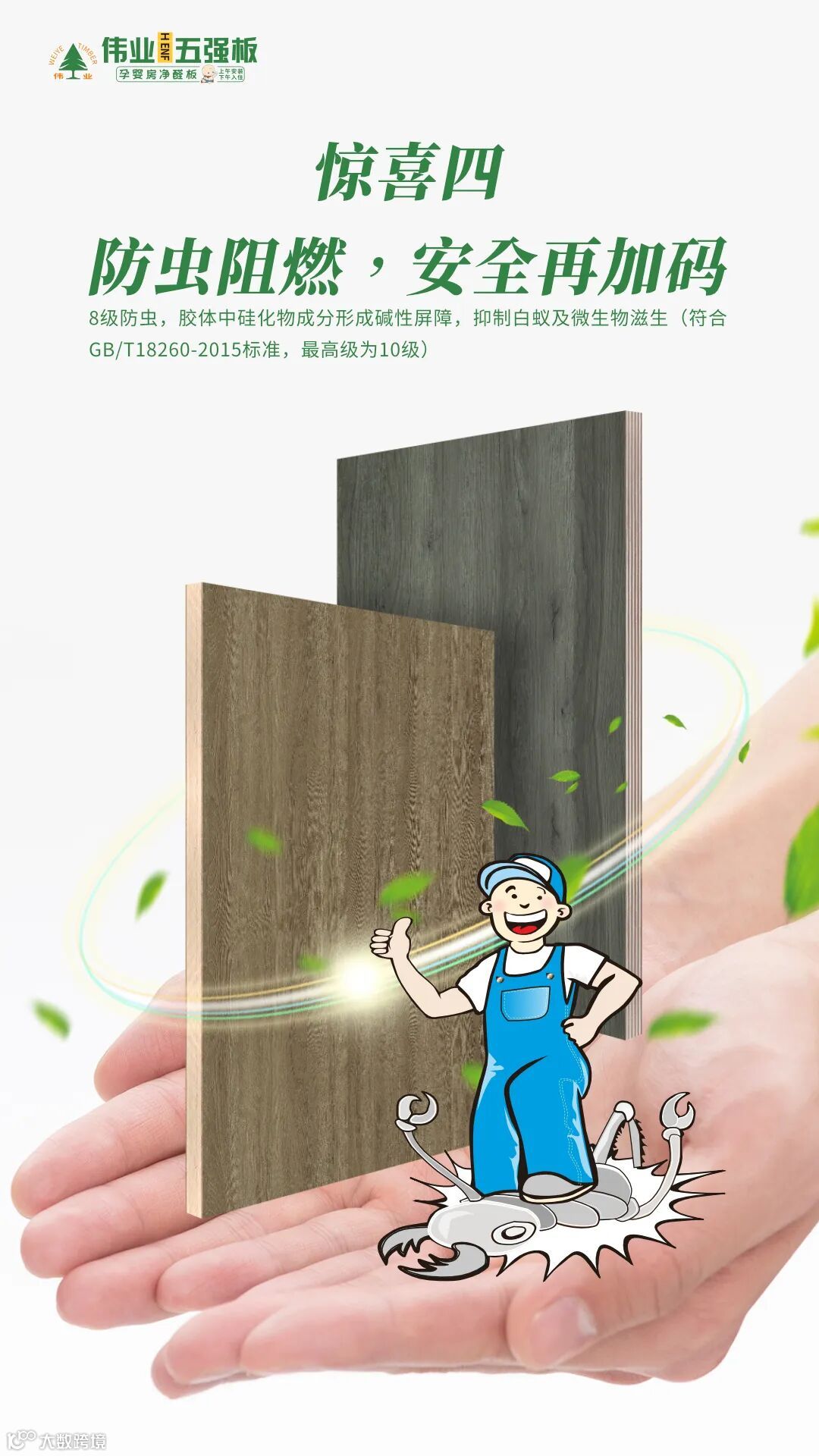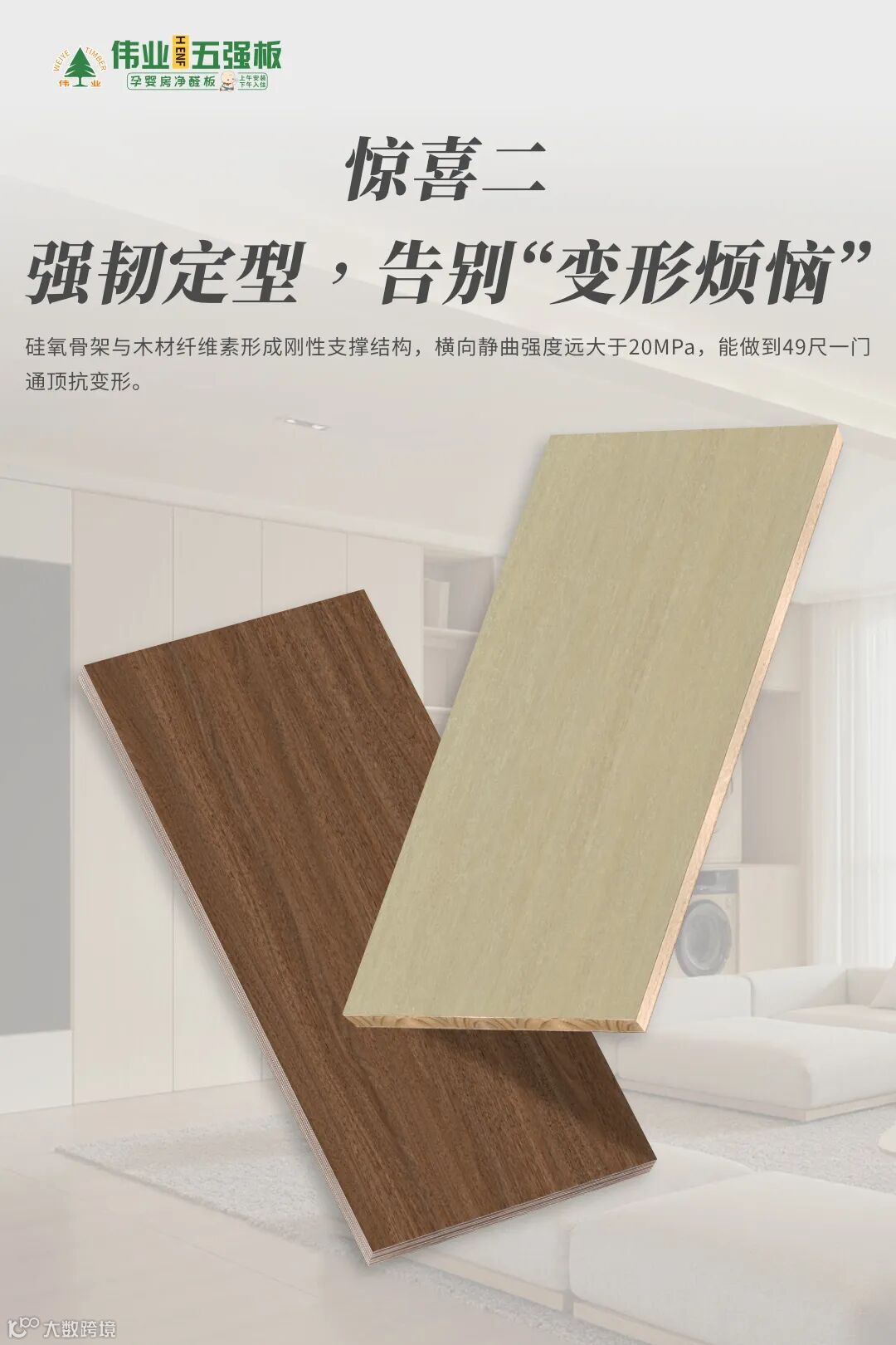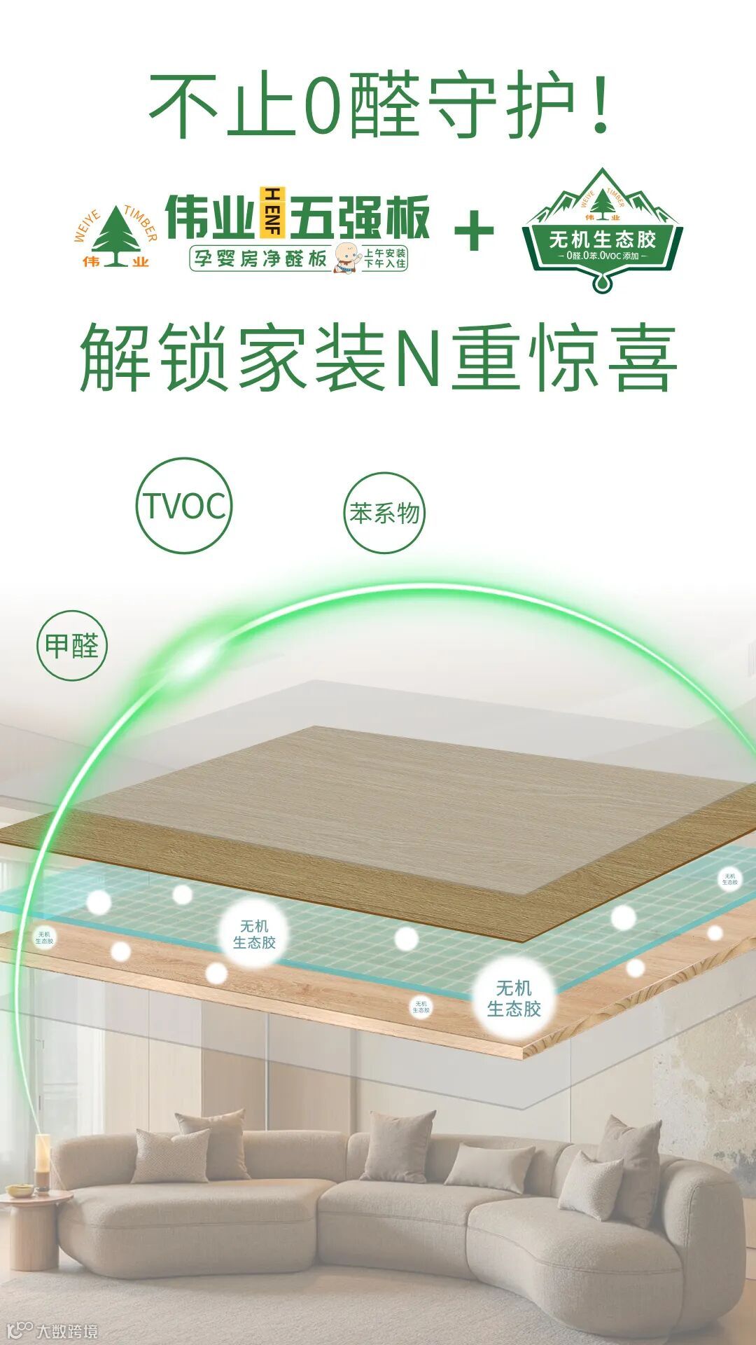 装修选板材,别再被“低价环保”忽悠!伟业五强板+无机生态胶,用天然矿物的力量终结甲醛、变形、掉链子难题,不止0醛守护,更带来强韧、防水、防虫、阻燃等多重惊喜,让家真正安全又抗造,装出你心中理想的模样!