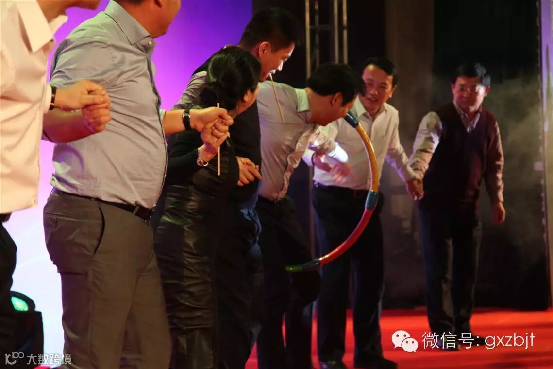 此外,远道而来的近20名分公司领导还上台参与了“环环相扣”的游戏。每人用嘴叼着筷子,主持人喊开始后,从左向右传递钥匙环;然后,右边最后一个人再拿起呼啦圈,先将其套在身上后再取出来,传递给下一个人。从右到左依次以同样的方式传递,最先完成的一队获胜。游戏充分体现了团队协作能力。