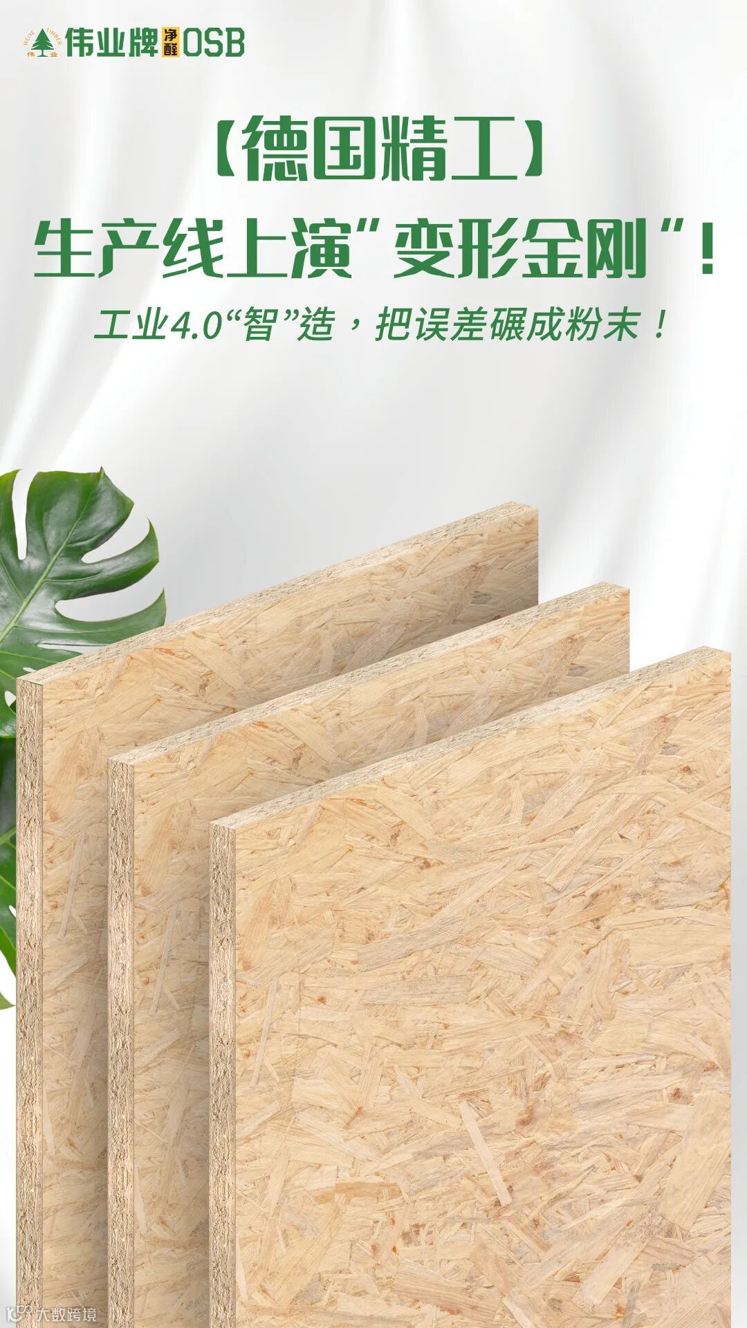 别再为“普通OSB”的妥协买单!选择伟业牌OSB,就是选择为你的家,装上“德国精工”的筋骨,注入“芯里无醛”的纯净,赋予“稳如磐石”的底气!