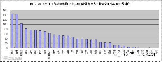 从查处的违法工程项目数量看,浙江、吉林、黑龙江、重庆、山东、湖北等6个省市查处力度大,分别为145个、144个、103个、82个、76个、76个,位居前列(见图1)。