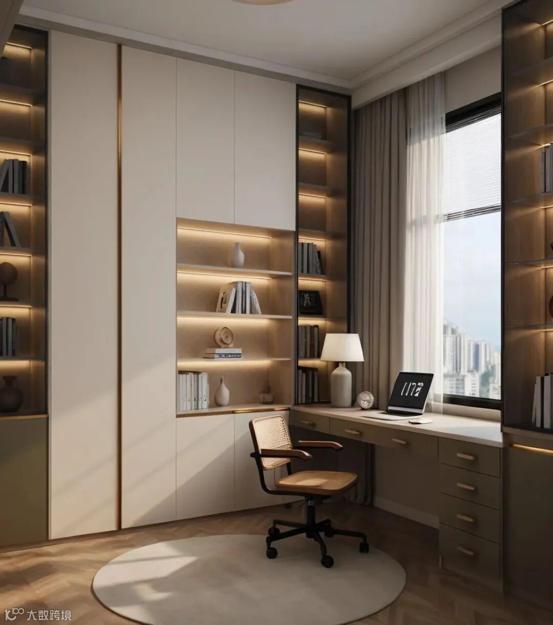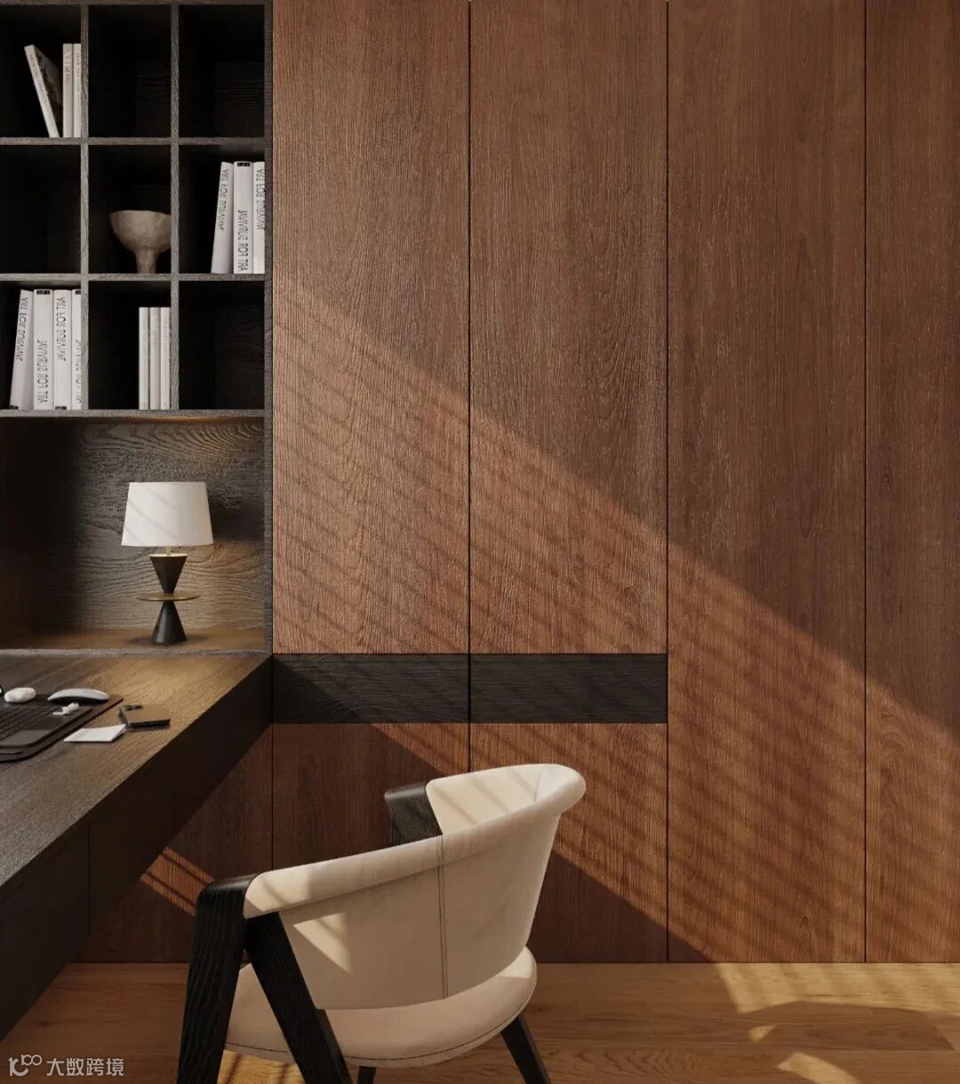 ✅ 书房:“安布赛德”花色+隐藏式灯带,满分的极简收纳!
