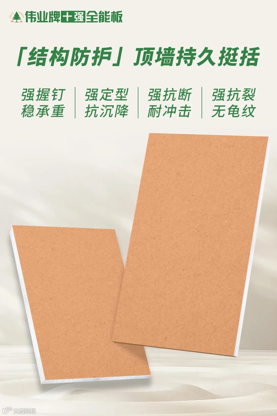 这些看似小问题,实则是顶墙材料埋下的隐患。而伟业十强全能板的到来,以“一板十强”的硬核实力改写规则,它不只是一块石膏板,更是为家打造的“顶墙安全堡垒”,让每个空间都能从容应对岁月考验。