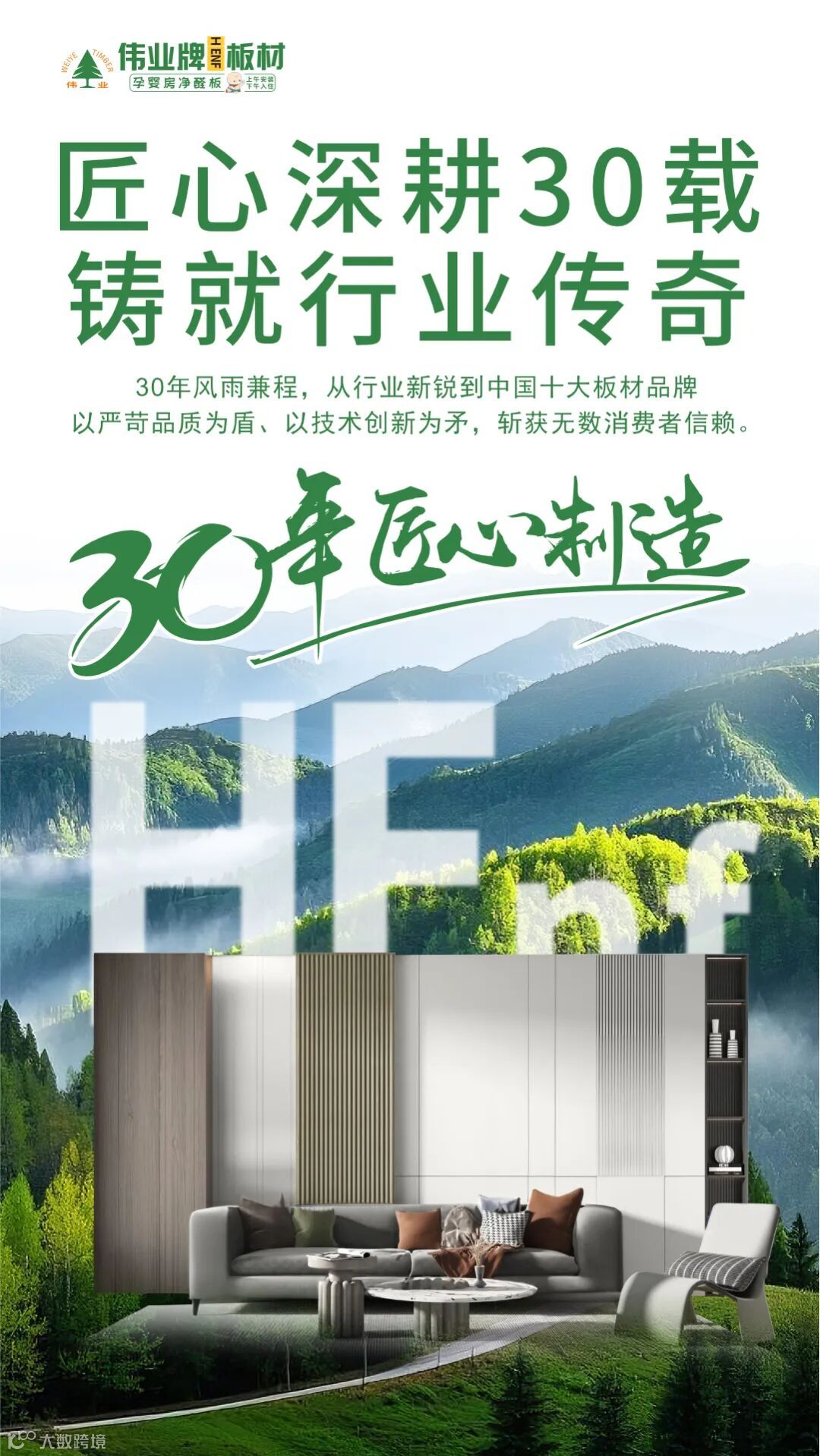 1996年至今,伟业牌HENF板材始终以「怕甲醛,选伟业」为使命,专注家居环保板材研发。