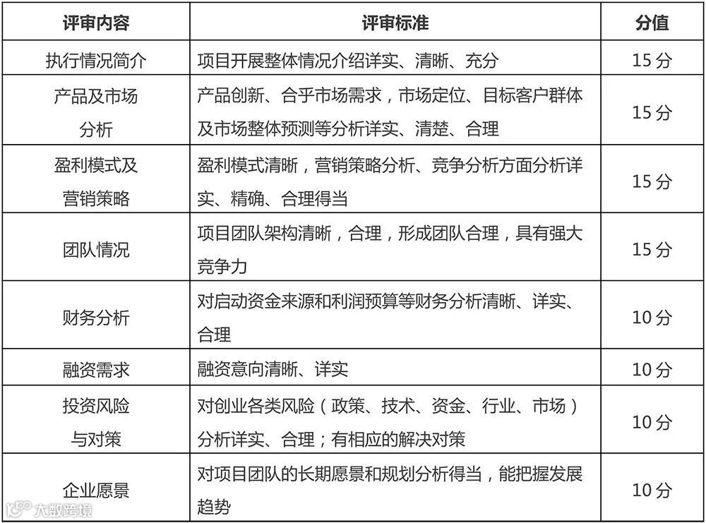 ▶分数设置及标准:满分为100分,主要从八个部分进行评审,包括:执行情况介绍、产品及市场分析、盈利模式及营销策略、团队情况、财务分析、融资需求、投资风险与对策、企业愿景;比赛形式为5分钟演讲+5分钟答辩;请根据参赛团队演讲及答辩表现,在评分汇总表上打总分。
