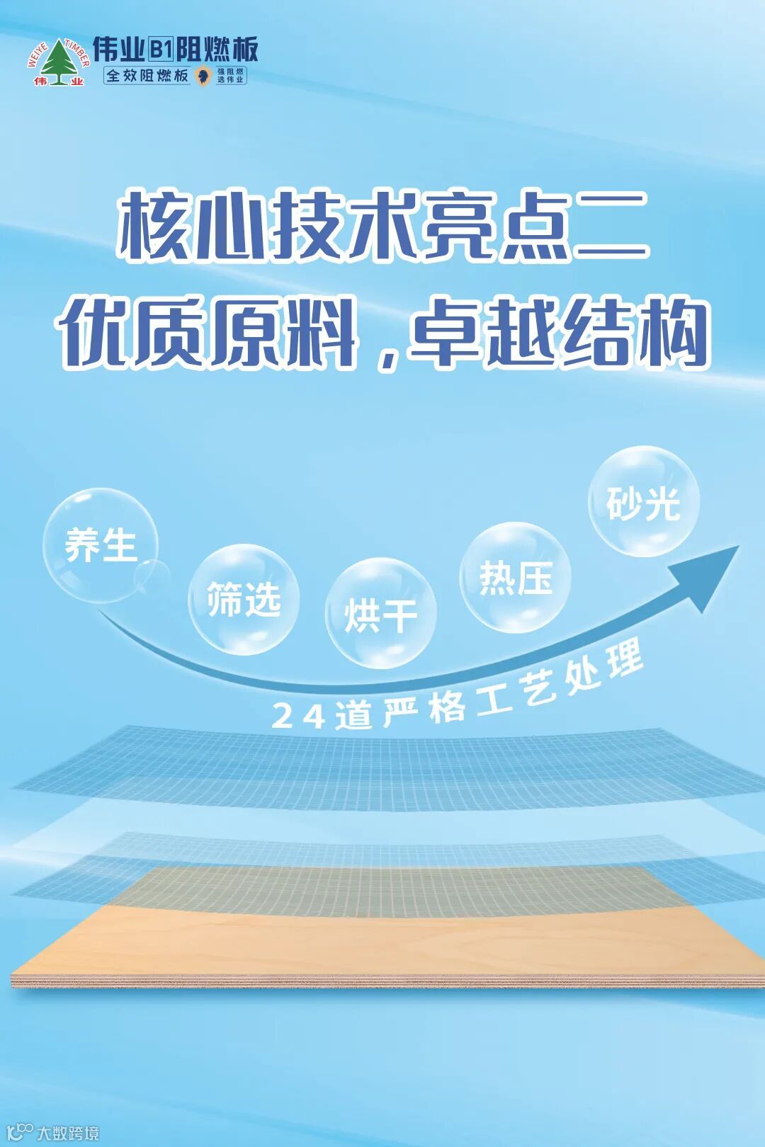 伟业牌阻燃板选用高品质原木作为基材,确保板材密度的均匀性和硬度的适中性,以及强大的握钉力。内部结构设计独特,采用多层纵横交错铺装,提升板材的稳定性和胶合强度,具有出色的抗压与承重能力。