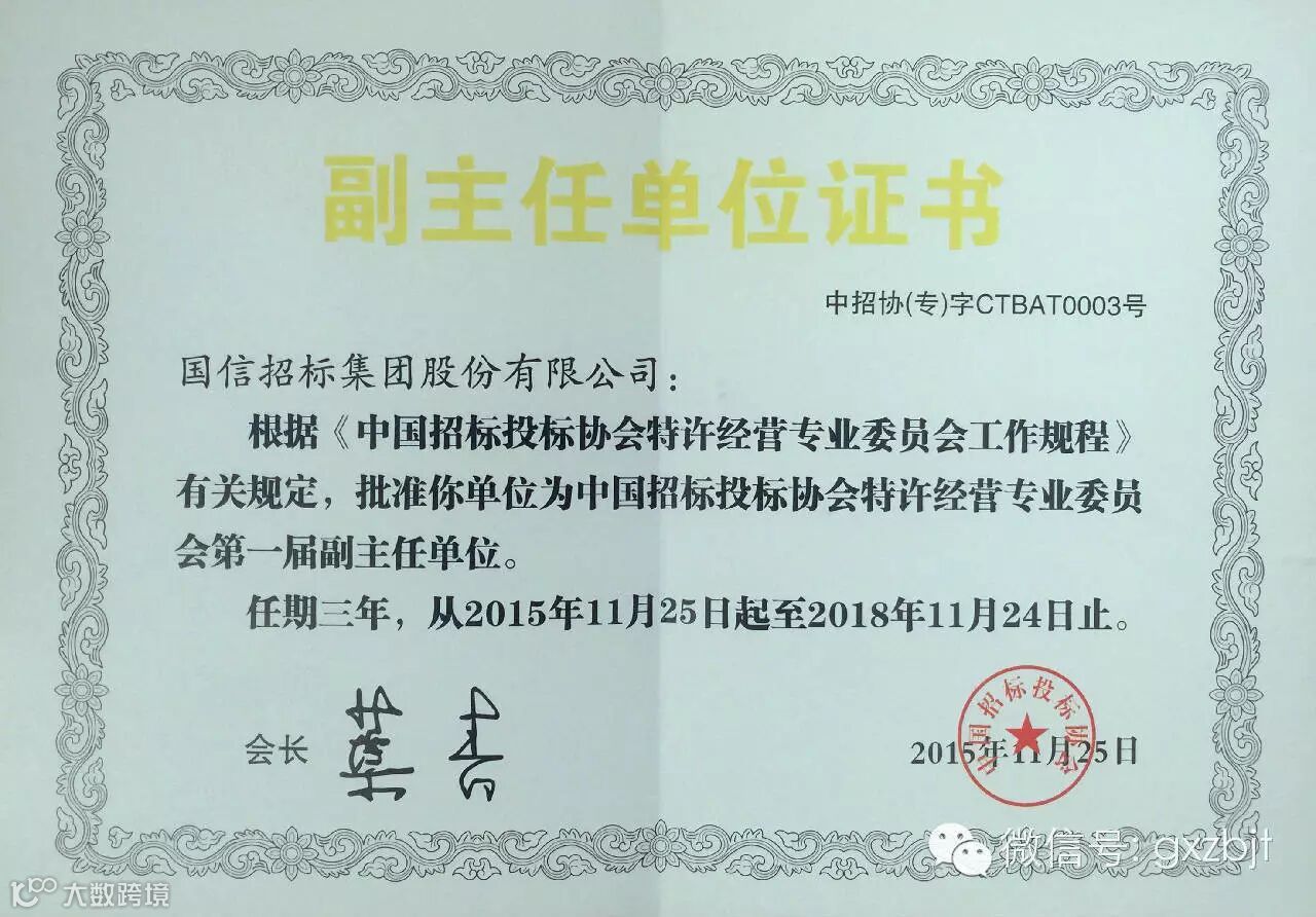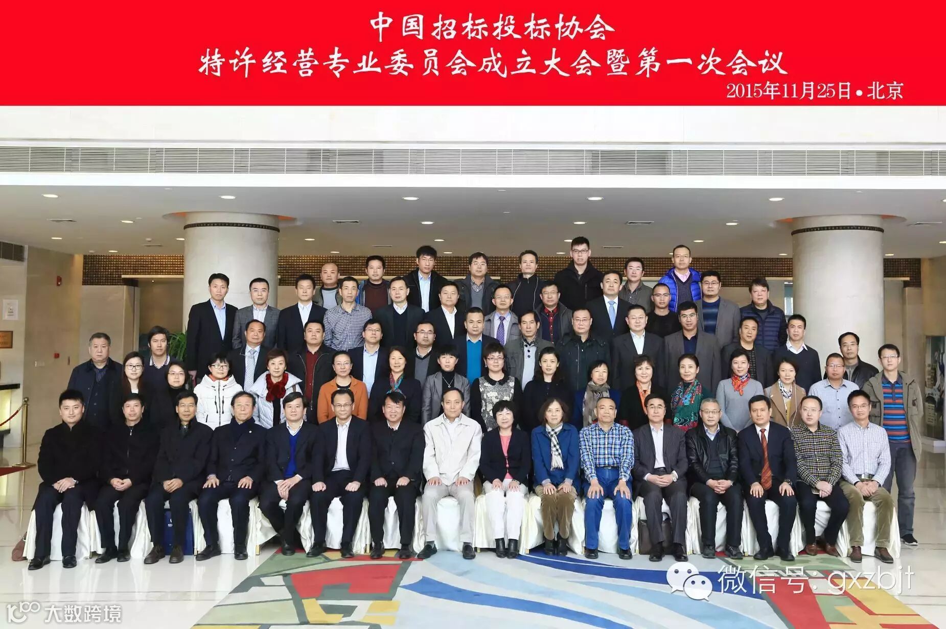 2015年11月25日,中国招标投标协会特许经营专业委员会成立大会暨第一次会议在顺义和园景逸大酒店召开。此次会议由中国招标投标协会主办,国信招标集团股份有限公司承办。国家发展与改革委员会法规司孟玮副巡视员、赵成峰处长、中国招标投标协会任珑常务副会长、贾建华副会长、毛林繁副秘书长、国信招标集团袁炳玉总裁,以及特许经营专业委员会的副主任委员及委员单位共70余人出席了会议。专委会由中国招标投标协会任珑常务副会长担任主任,设有副主任单位15家,委员单位38家。国信招标集团有幸当选副主任单位及第一届的执行主任。