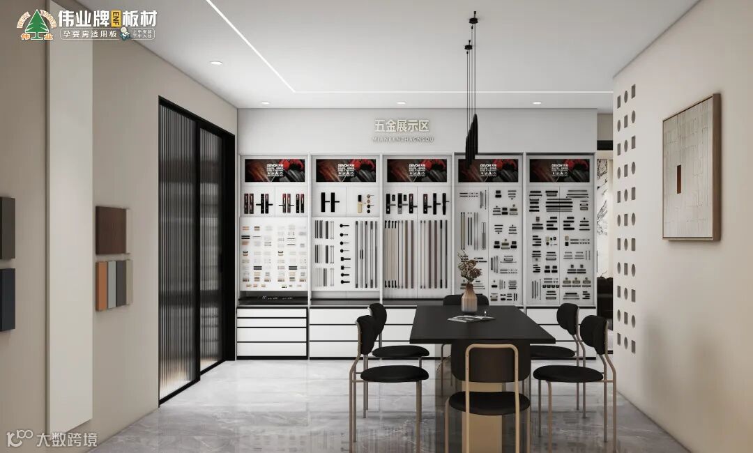 展示区内陈列着各种高品质、与伟业牌ENF板材完美匹配的五金配件,包括拉手、铰链、滑轨等。这些五金配件不仅外观精美、质感上乘,更在耐用性、安全性方面有着卓越的表现。顾客可以通过对比与体验,选择最适合自己家居风格的五金配件,为整体家居设计增添点睛之笔。
