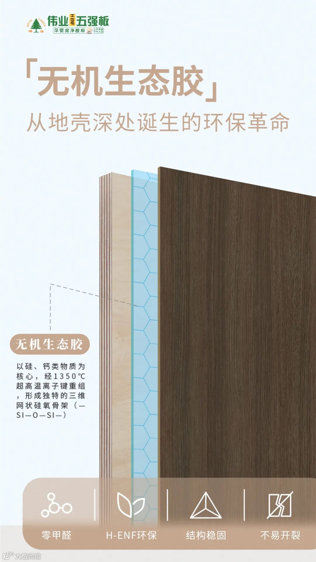 伟业五强板的无机生态胶,灵感源自地壳天然矿物,以硅、钙类物质为核心,经1350℃超高温离子键重组,形成独特的三维网状硅氧骨架(—Si—O—Si—)。这一颠覆性技术彻底摒弃碳基有机物,实现零甲醛、零苯系物、零 TVOC 添加,从根源上终结板材污染!