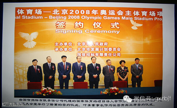 签约仪式:2003年8月9日上午,在人民大会堂举行,北京奥组委常务副主席、北京市副市长刘敬民、国信招标集团董事长叶青和中标人代表参加签约仪式。