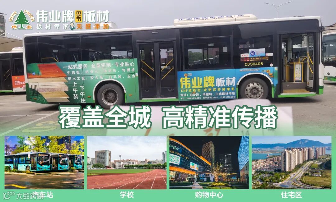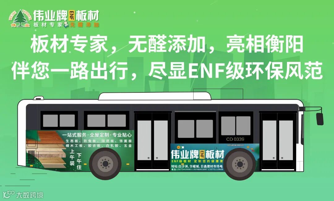 此次公交车体广告线路涵盖衡阳的主要干道、汽车站、学校、购物中心、住宅区等人流密集的场所,借助公交“快”、“远”、“稳”的优势,形成了强大的宣传推广攻势,具有贴近用户、冲击力强、渲染力大的推广效果,大大提升伟业牌ENF板材的品牌形象。