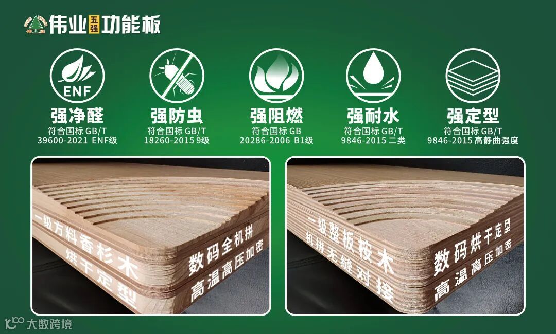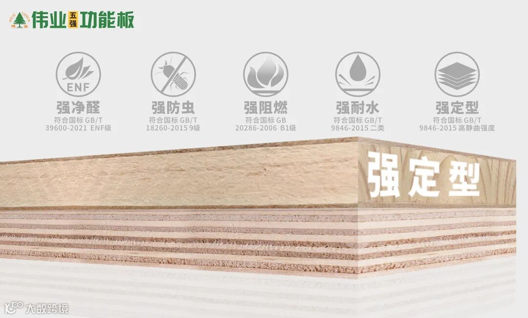 伟业牌ENF板材从消费者的需求角度出发,整合行业一流研发资源,伟业五强功能板新品聚合强净醛、强防虫、强阻燃、强耐水、强定型五大功能,以匠心研发,洞见高端品质,致力于为消费者解决在家居方面的诸多痛点问题,构建整体全健康生态,真正服务好每一位客户。