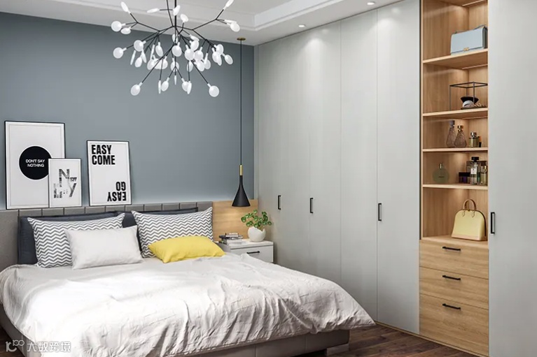 莫兰迪格调,做半开放衣柜,黑色拉手+玻璃门+层板,提升精致感。栅格的床头墙、原木风的床具,氤氲柔情与细腻,温馨感不言而喻。