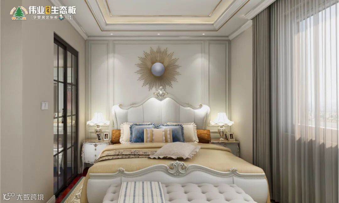 暖白的到顶衣柜,色彩简约,造型简单,和欧式的床具、挂画等相得益彰,把高级的气质衬托得恰到好处,让空间增加浪漫的色彩。