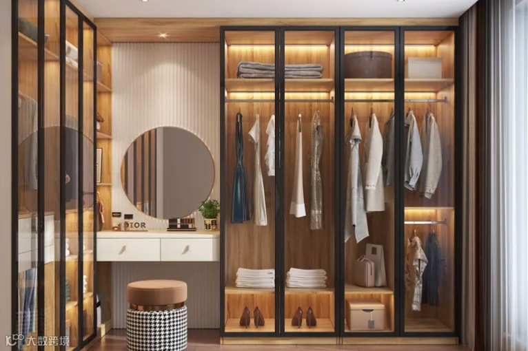 布局是开放收纳、玻璃门挂衣区、封闭收纳区三结合,没有过分的奢华与浮夸,色调温馨素雅,为休息空间融入一份自然与舒适,每一个角落都充满优雅与魅力。