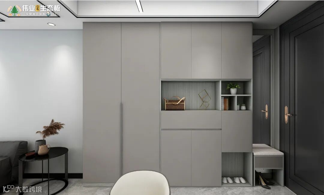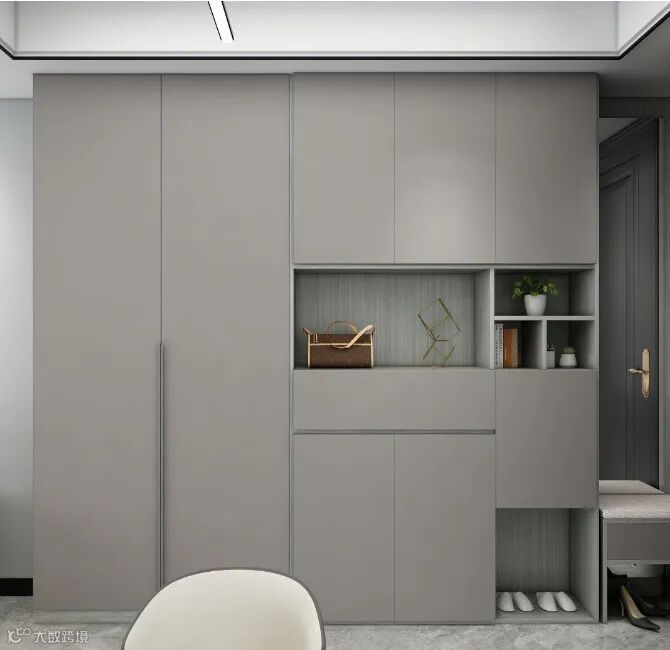 开门入户,一体化多功能玄关柜,以灰色为主,打造潮流的设计感,暖灰的木饰面为辅,营造不同色调的层次感,空间呈现高级、流畅的简约之美。