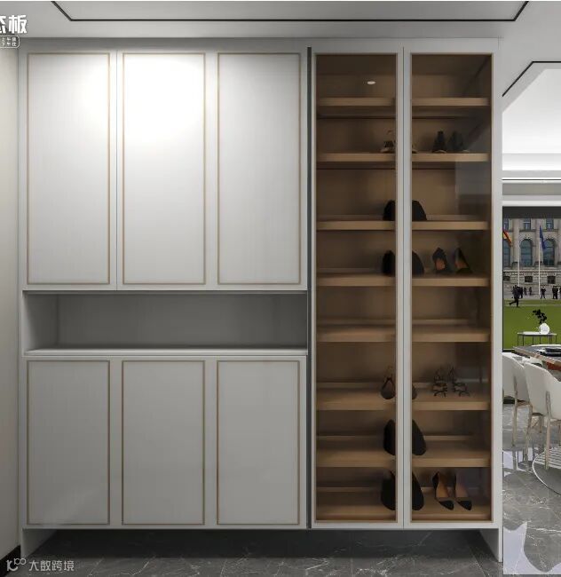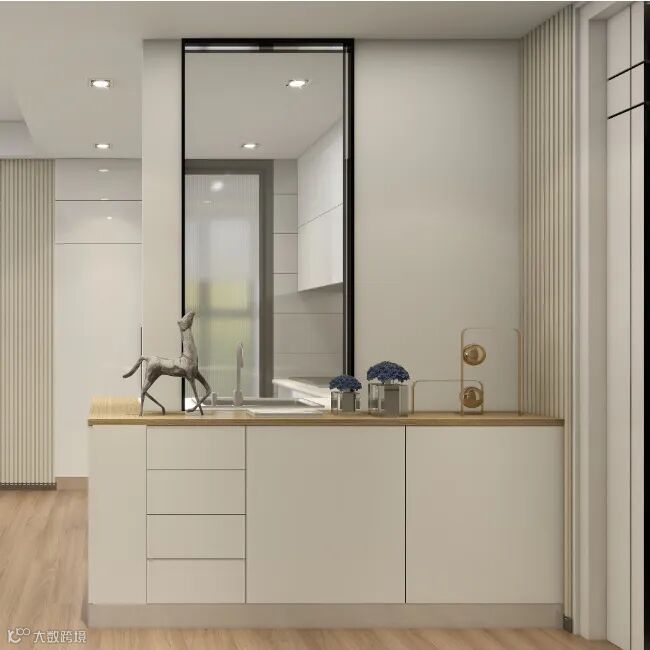 玄关是“门面担当”,采用简奢的陈设手法,整体化繁为简,白色金边描框柜体+原木玻璃门展示柜,于简单中见奢华,优雅自成一派,让你从容出门,归家舒心。