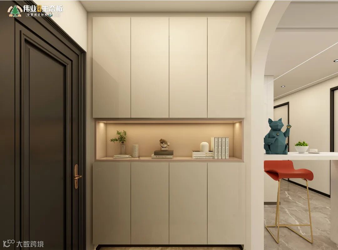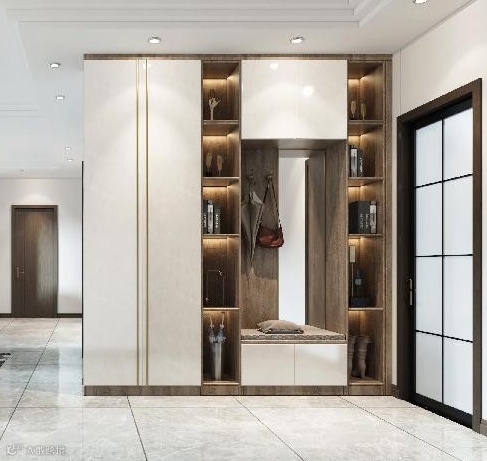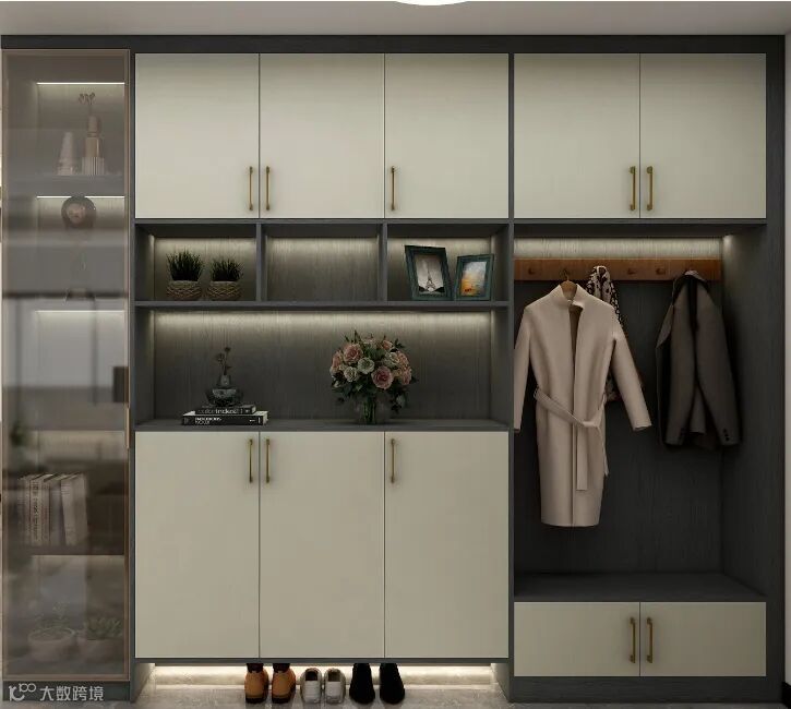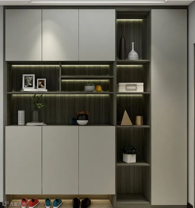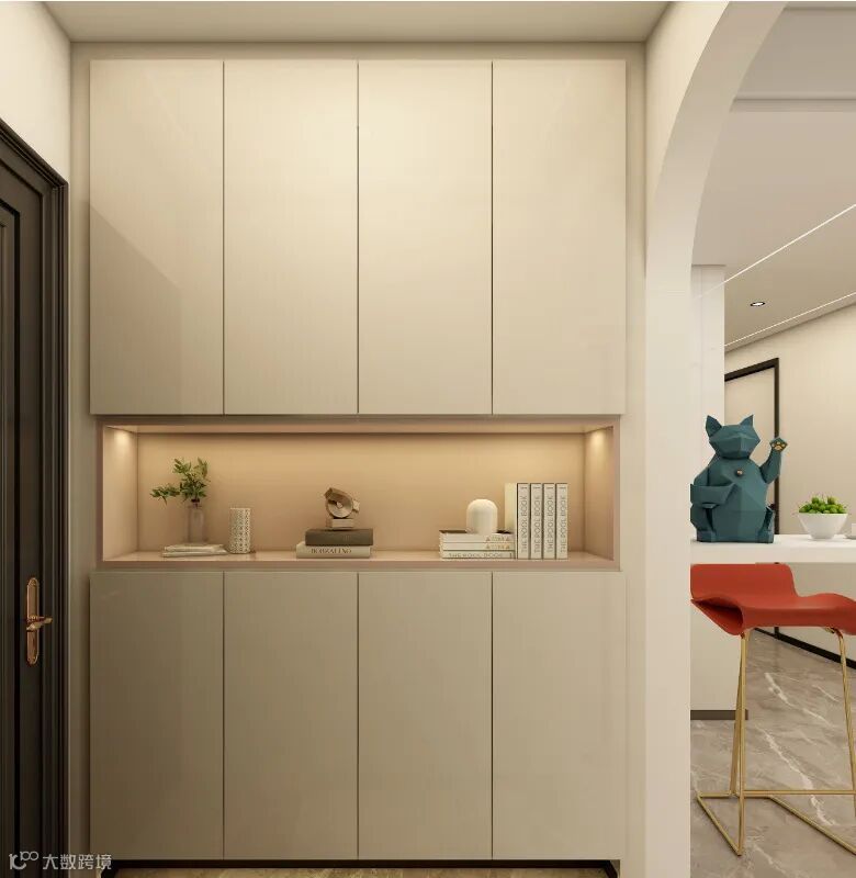 嵌入式通顶玄关柜,布局有藏有露,开放平台以展示为主,引入白光灯带,底部做悬空设计,增加通透感,在光影下平添流动的视觉美感。