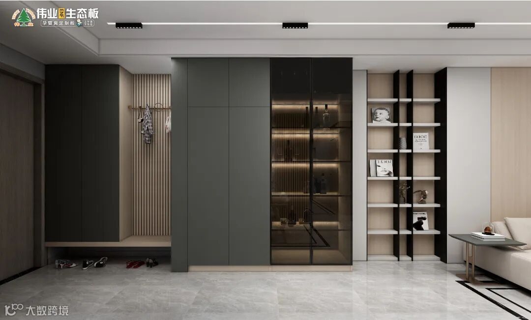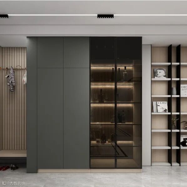 将形态重新组合,玄关做联排收纳设计,冷峻的深色、柔和的浅色,加入格栅+挂钩、玻璃柜门、灯带,完美摆脱冰冷的气质,让入户呈现耳目一新的质感。