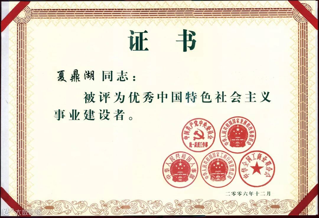 2006年12月,夏鼎湖董事长被中共中央统战部、国家发改委、人事部、国家工商总局、全国工商联等五部门联合授予“第二届优秀中国特色社会主义事业建设者”荣誉称号。