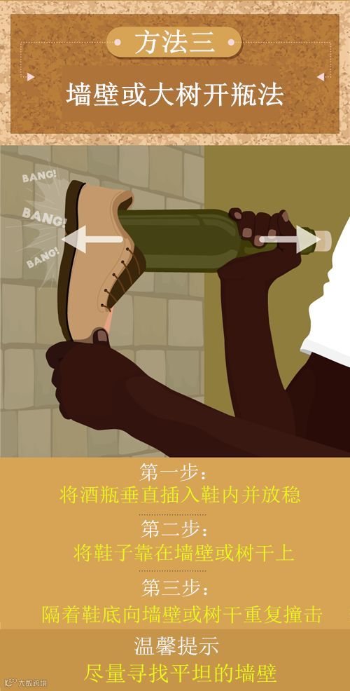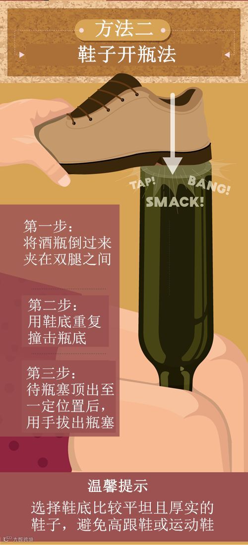 如果手边没有开瓶器,该怎么把酒打开呢?下面,让我们通过图片学几招吧。