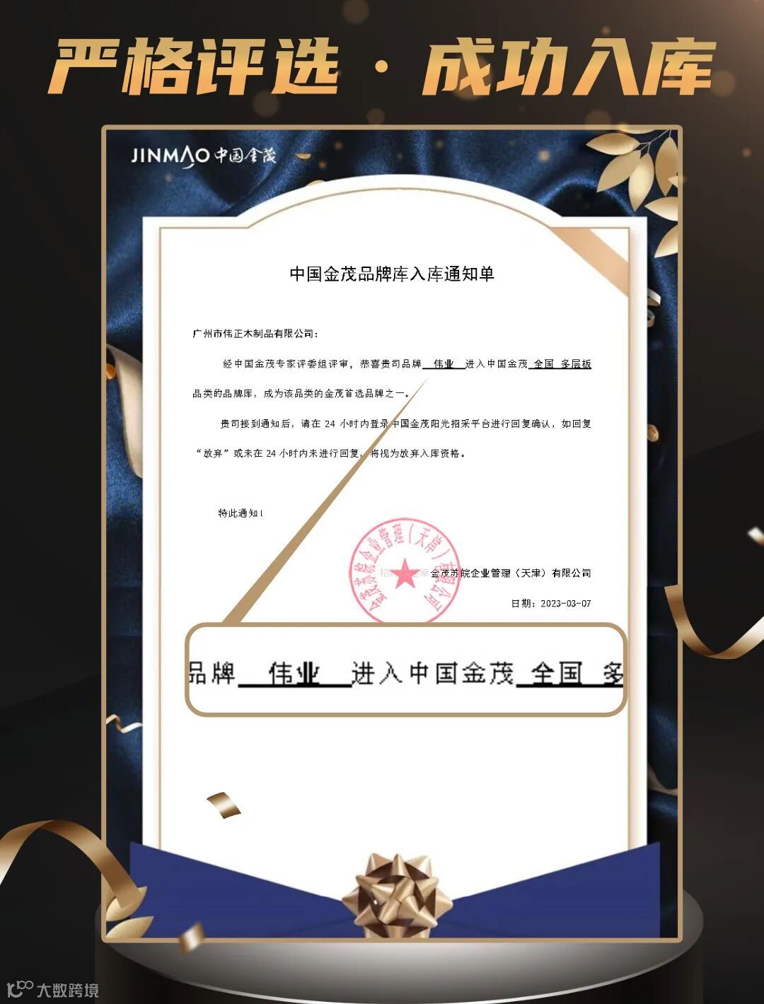 近日,伟业牌旗下的阻燃板、细木工板、多层板以优质的品牌口碑、领先的技术优势、完善的配套服务,成功进入中国金茂全国多层板品牌库,彰显了伟业牌日益增强的综合实力!